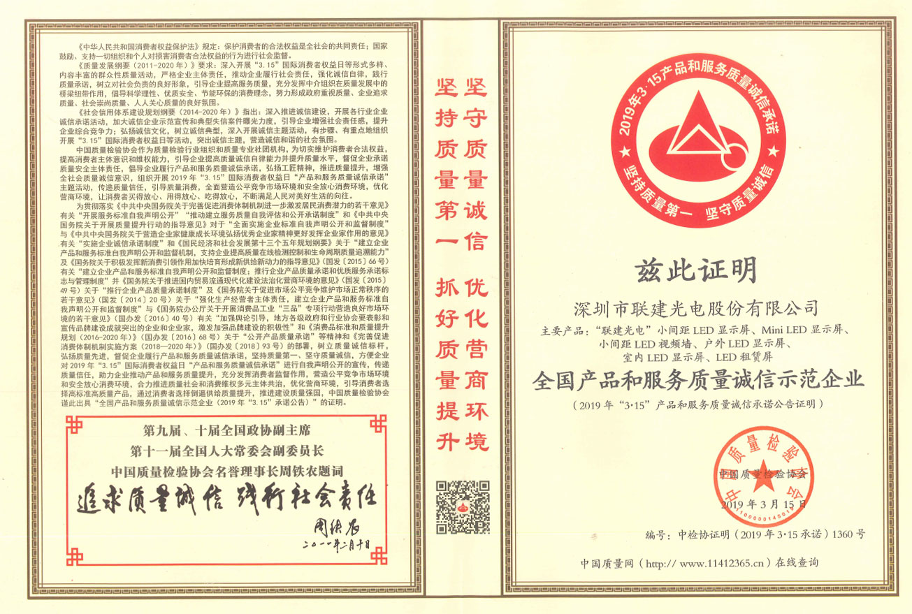 感谢客户及合作伙伴一直以来对“联建光电”品牌关注与支持,我司自始至终将产品的品质与质量视为立足之本,为广大消费者提供高品质、高质量的产品和服务。