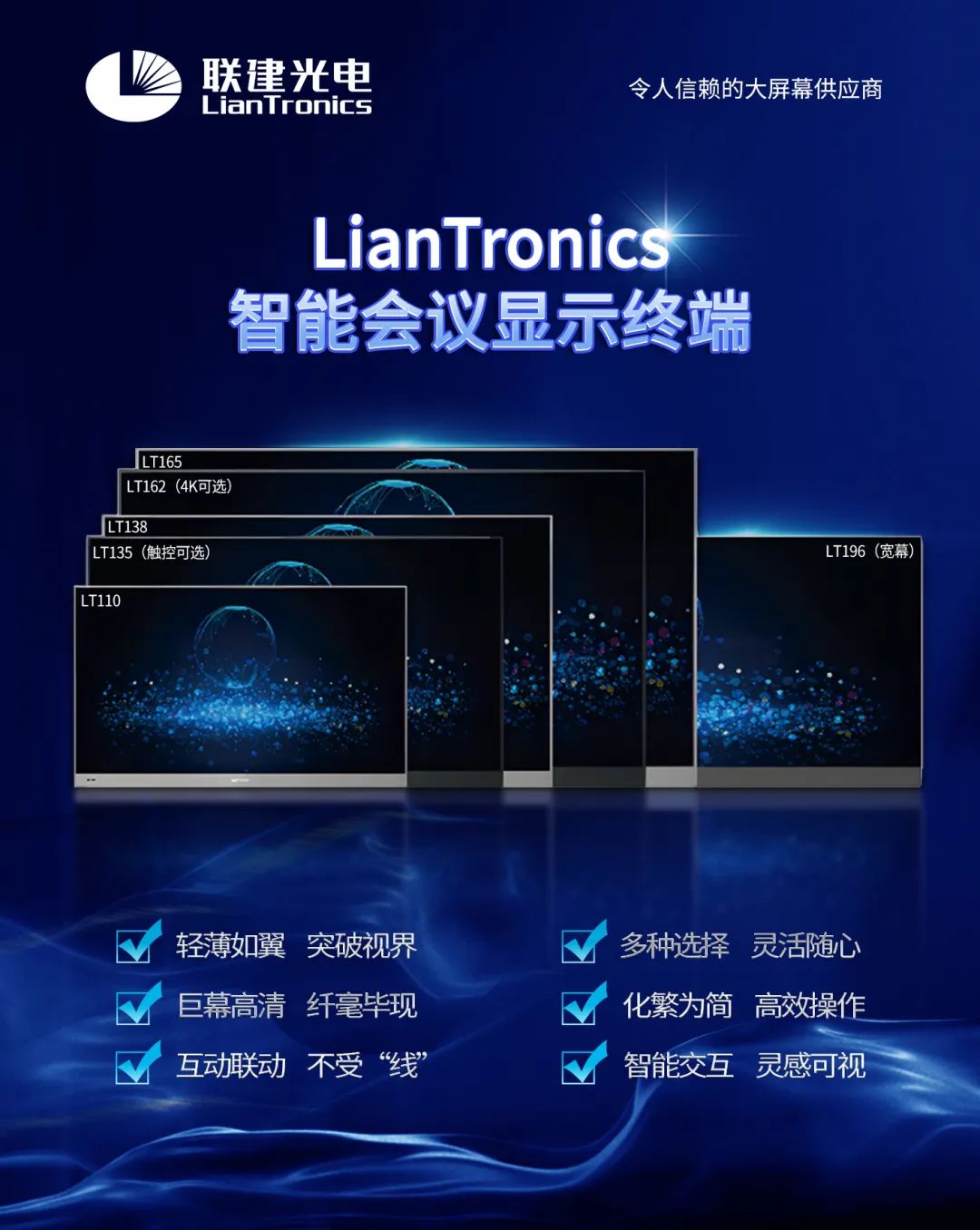 联建光电智能会议显示终端为各类TOP企业会议室提供可视化服务,轻松实现语音、视频实时同步沟通,突破时空障碍快速汇集多方观点。多种系统、多种尺寸可选,实现千行百业全覆盖。