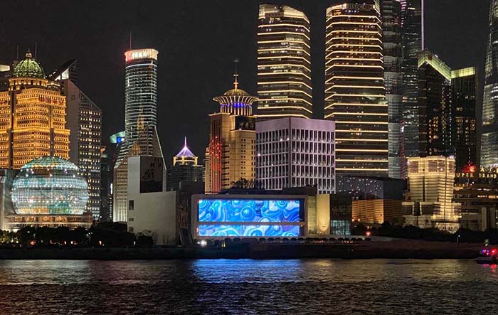 此外,步行在外滩边上,带有上海浦东美术馆LOGO的创意异形显示建筑同样引人注目,100余块创意异形显示屏完美镶嵌在建筑内,组成“福”字外形,每一块屏幕切割都完美贴合建筑设计;同时为了让上百块LED显示屏联动显示成整体关联画面,项目研发团队摒弃传统显示软件创新采用分布式系统,挑战显控新高度。