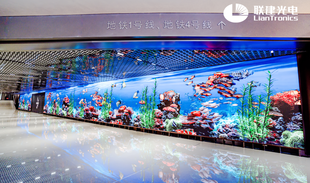 联建光电为其打造的这套屏幕长33米,位于商场与地铁1/4号线的连接通道内21424x1560的超高分辨率带来绝佳的显示效果
