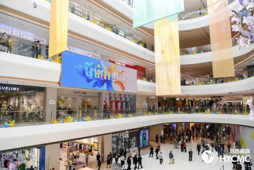 在商场室内,一块平面大屏悬于环形商场中间,一进门便引人注目。这块屏上滚动播放商场店铺信息,承接大量商业广告,吸睛的位置使其极具商业价值,室内外多屏联动激活商业潜力。